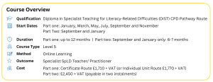 The Level 5 Diploma in Specialist Teaching for Literacy-Related Difficulties (DIST) CPD Pathway route is an alternative route compared to the ‘fast track’ option for graduates. This route is for those who have at least one year recent and relevant experience in a school or college setting working with learners with literacy difficulties/ dyslexia/ SpLD.